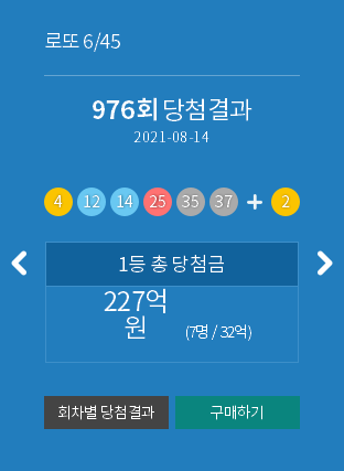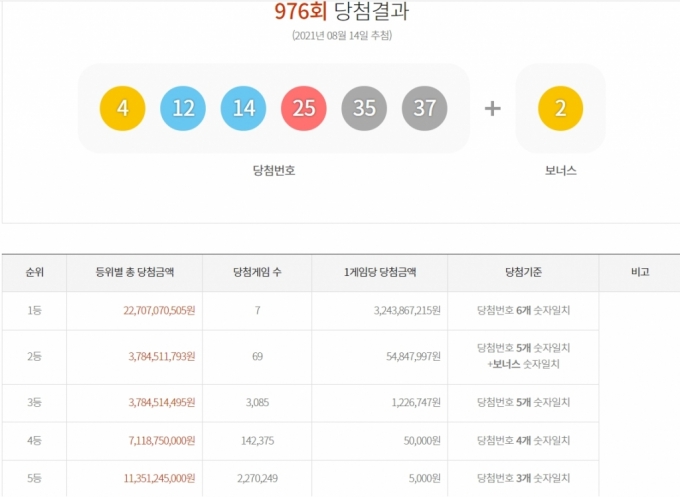 제976회 로또 1등 당첨번호는 '4, 12, 14, 25, 35, 37 + 2(보너스번호 ... from cdn.joygm.com Maybe you would like to learn more about one of these? Check spelling or type a new query. 976 회 로또 당첨 번호. We did not find results for: